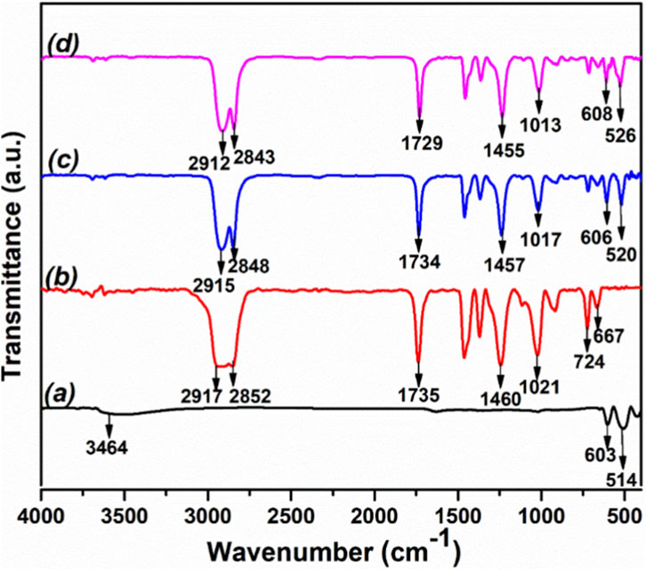 Figure 1. FTIR spectra of (a) CuO, (b) EVA/CPE blend, (c) EVA/CPE/5 wt% CuO and (d) EVA/CPE/10 wt% CuO.
