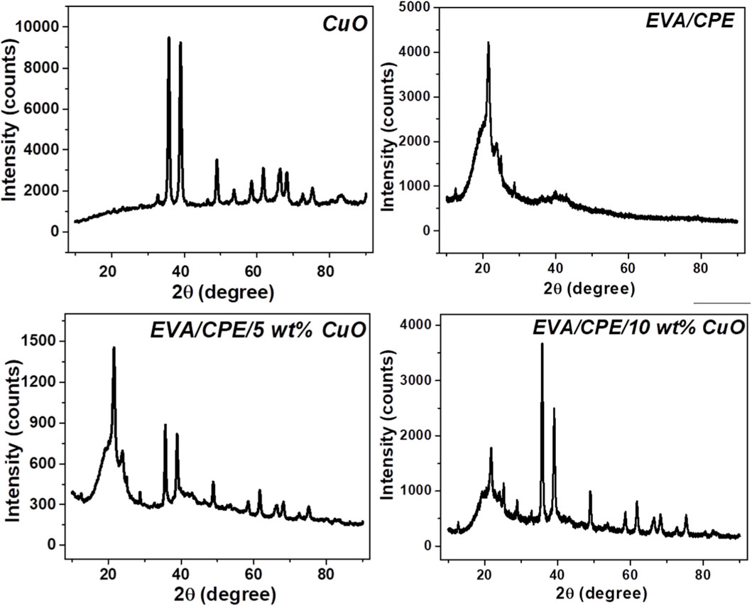 Where D represents the mean crystallite size, β is the full width at half maximum of XRD peaks, θ is the Bragg’s angle, k is the shape factor and λ is the wavelength of the X-ray. The average crystallite size of CuO nanoparticles is calculated to be 13.3 nm, whereas for EVA/CPE/5 wt% CuO and EVA/CPE/10 wt% CuO nanocomposites, it increases to 14.23 nm and 14.79 nm, respectively.