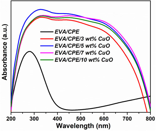 Figure 3 illustrates the absorption spectra of EVA/CPE polymer blend and EVA/CPE/CuO nanocomposites in the 200–800 nm wavelength range. The spectrum of pristine blend displays a broad band around 280 nm, linked to n-π* electronic transitions of the lone pair electrons in Cl and carbonyl group in the polymer backbone (Suhailath et al., 2017). All the nanocomposites display increased absorbance peak intensity and a shift in absorption edges to longer wavelengths relative to the pristine blend, reflecting its enhanced light absorption. This arises from the strong interfacial interactions between the polymer and nanoparticles, which alter the electronic band structure and lower the energy gap associated with the electronic transitions. The red shift is particularly evident in the EVA/CPE composite with 5 wt% CuO, which can be ascribed to the enhanced contact area and the robust interaction between the components resulting from the consistent distribution of nanoparticles throughout the matrix. However, beyond this loading, a gradual decrease is observed as a result of the clustering of nanoparticles, which restricts smooth electronic transitions within the polymer structure.