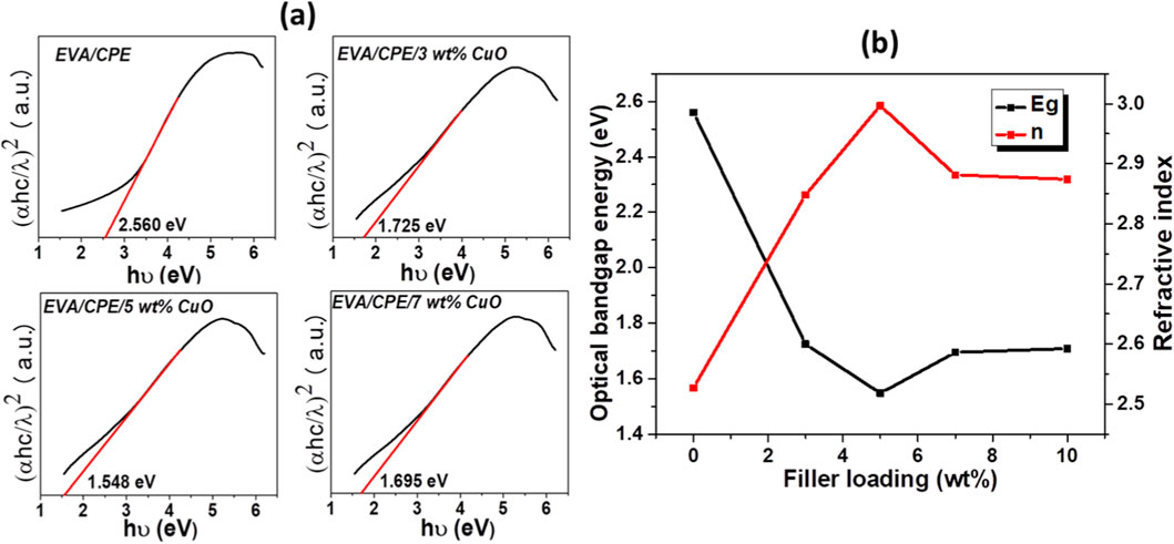 The refractive index (n), which governs light-matter interactions, is a crucial optical parameter for the design of optoelectronic devices. The n values of EVA/CPE blend and EVA/CPE/CuO nanocomposites are calculated using the Dimitrov–Sakka equation as given in Equation 3 (Yassin et al., 2019)