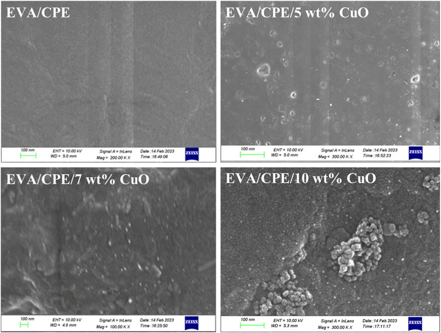 FE-SEM images of EVA/CPE blend and its CuO nanoparticles-reinforced composites are depicted in Figure 5. The EVA/CPE blend displays a smooth and consistent surface structure, suggesting compatibility between the component polymers and formation of a homogeneous matrix. With the addition of CuO nanoparticles, notable changes in surface morphology are observed. The 5 wt% CuO-loaded blend exhibits uniformly distributed short, rounded tear lines, signifying effective CuO-matrix interaction and retention of structural regularity. Such morphology indicates that the nanoparticles are uniformly distributed throughout the matrix and are significantly interacting with the polymer chains, thereby enhancing efficient stress transfer and reinforcing the continuity of the intermolecular network. These characteristics align with previously reported findings that underscore the significance of well-dispersed nanoparticles for establishing continuous structural linkages within the blend matrix (Ahmad et al., 2024). At elevated loading levels, especially at 10 wt%, the structural integrity is significantly compromised, resulting in the emergence of a rough surface characterized by white clusters of varying dimensions. This non-homogeneous morphology is attributed to the agglomeration of nanoparticles, which occurs when the nanoparticle-nanoparticle interactions dominate over nanoparticle-polymer interactions (El-Naggar et al., 2024). This heterogeneous structure interrupts the continuous polymer network and diminishes intermolecular cohesion, resulting in a significant reduction in the structural integrity of the composite.