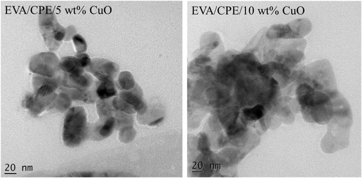 HR-TEM analysis serves as an advanced characterisation method that enables visualisation of materials at the atomic scale, which provides a detailed representation of the size and shape of nanoparticles and their distribution within the blend matrix. TEM images (Figure 6) reveal high structural regularity for EVA/CPE/5 wt% CuO nanocomposite with well-ordered dispersion of spherical and elliptical-shaped nanoparticles in the blend matrix. The uniform dispersion implies the interaction of CuO nanoparticles with the polar groups (carbonyl and Cl) in the EVA/CPE blend. However, the nanocomposite demonstrates an uneven structure at a high CuO loading of 10 wt%, as a result of the clustering of nanoparticles, which is consistent with the FE-SEM studies.
