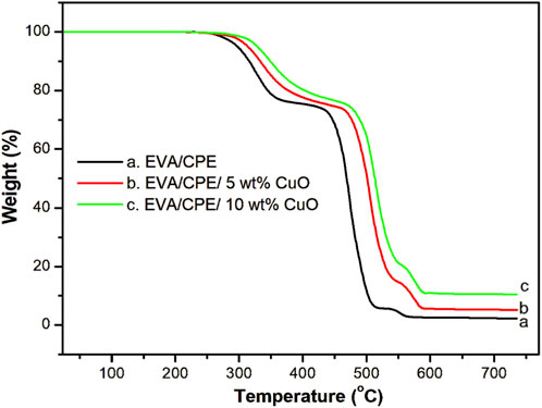 Figure 7 illustrates the TGA profiles of EVA/CPE blend and EVA/CPE/CuO nanocomposites. Both the blend and the nanocomposites exhibit a three-step thermal degradation. The onset temperature marking the first weight loss across all the samples is observed at 280 °C, which corresponds to two sequential events occurring within the blend: the release of acetic acid from the vinyl acetate groups in EVA and the dehydrochlorination of CPE (Ramesan and Alex, 1998; Ramesan, 2005). The first weight loss for 5 and 10 wt% CuO incorporated blend occurs at 303 °C and 319 °C, respectively. This is attributed to the breakdown of the carbonaceous backbone through random chain scission, accompanied by the release of volatile compounds and low-molecular-weight hydrocarbons. The second phase of thermal decomposition for the EVA/CPE blend, EVA/CPE/5 wt% CuO, and EVA/CPE/10 wt% CuO occurs at ⁓438 °C, ⁓467 °C, and ⁓483 °C, respectively. The increased degradation temperature and reduced weight loss in the nanocomposites indicate its enhanced thermal stability. The strong interfacial interaction of CuO nanoparticles with the blend matrix, along with their barrier effect and heat-shielding capacity, contributes to this improvement (Ge et al., 2025). This is supported by the increase in char residue obtained after the complete degradation of the samples at 750 °C. The residual mass percentages for EVA/CPE blend with 0 wt%, 5 wt% and 10 wt% CuO are 1.53%, 5.01% and 10.12%, respectively. The char residue on the surface of the composite serves to protect it from further disintegration by functioning as a barrier against the diffusion of heat and oxygen (Li et al., 2023).