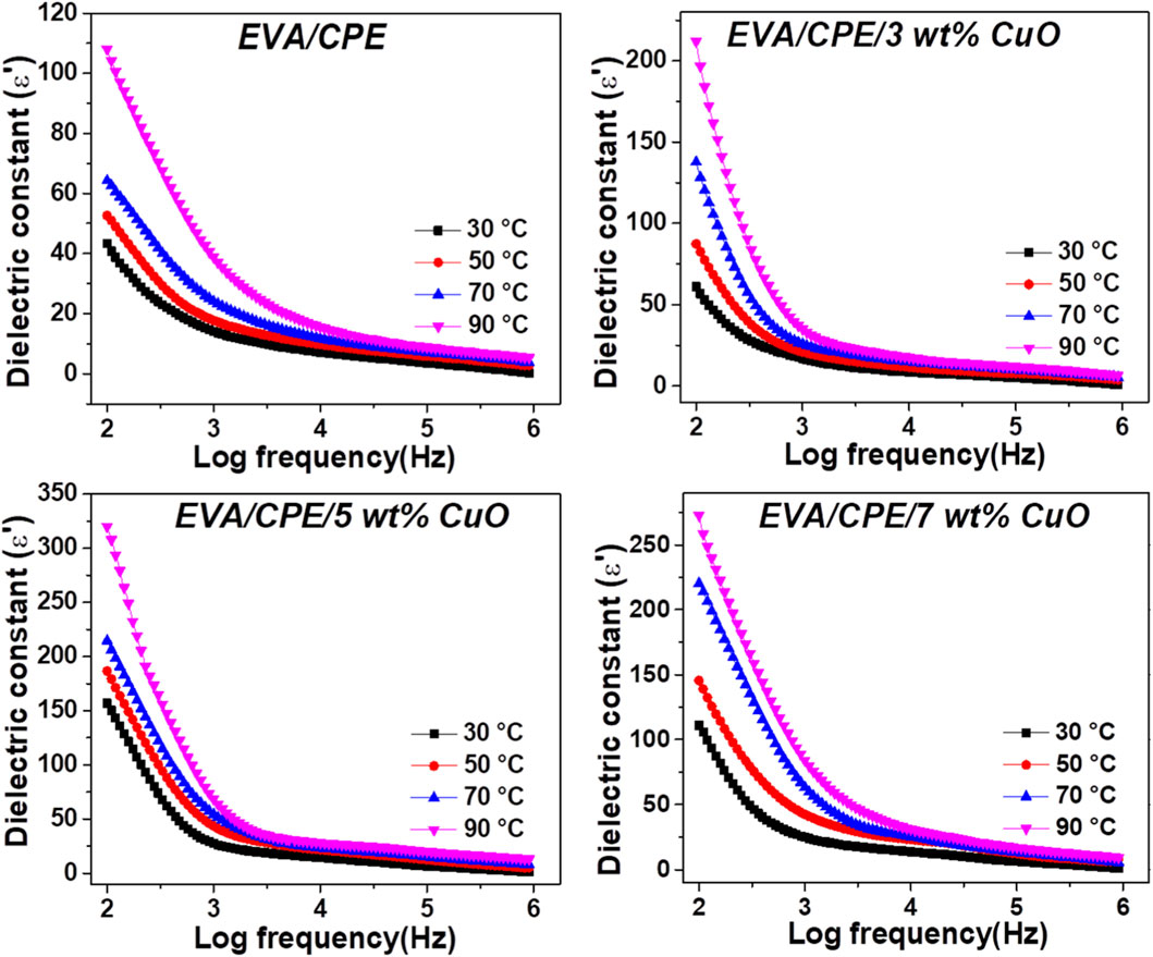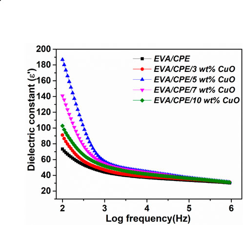 The dielectric constant (ε′) representing the real component of the complex permittivity and the energy storage capacity, is influenced by various types of polarization such as atomic, electronic, orientation and interfacial. These effects can be examined through the frequency-dependent ε′ of EVA/CPE blend and EVA/CPE/CuO nanocomposites measured at room temperature, as depicted in Figure 8. The dielectric constant is calculated using Equation 4 as given below: