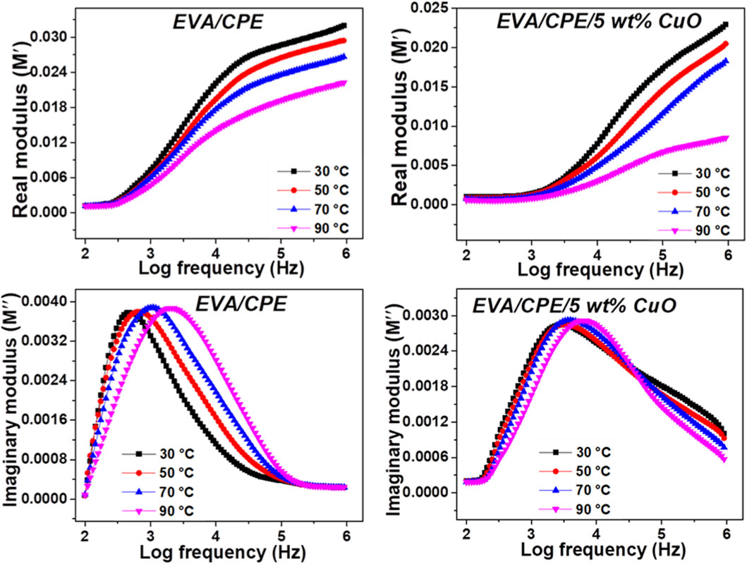 Anwar et al. (2022). The variation in M′ and M″ values with frequency measured at temperatures between 30 °C and 90 °C for EVA/CPE blend and EVA/CPE/5 wt% CuO is depicted in Figure 10. The real part of the electric modulus provides an assessment regarding the charge storage capacity. The minimal values of M′ at low frequencies indicate the lack of a substantial restoring force, which enables the charge carriers to respond readily to the applied field. This trend suggests that the impact of electrode polarization is negligible and thus ignored. The high-frequency region displays an elevation in M′ values relative to frequency due to relaxation processes (Aziz and Abidin, 2015). A more precise understanding of the dielectric relaxation phenomenon can be attained by the imaginary component of the electric modulus, which quantifies dielectric loss. The M″ versus log frequency graph of the data reveals the presence of asymmetric loss peaks. At low frequencies, M″ remains negligible due to less energy dissipation. As frequency increases, M″ rises, reaching a peak at the frequency where the hopping rate of charge carriers or relaxation process resonates with the applied electric field. This peak signifies substantial relaxation, negligible electrode effects, and optimal energy dissipation. After this peak, M″ declines with increasing frequency due to the inability of dipolar and ionic relaxation processes to synchronize with the rapidly fluctuating electric field. The broad and asymmetric peaks imply non-Debye type relaxation, indicating a distribution of relaxation times, which arises due to interfacial polarization and structural disorder in the composite (Zhao et al., 2022). The average relaxation time (τ) is related to the characteristic frequency (fc) or relaxation frequency, according to the relation; τ