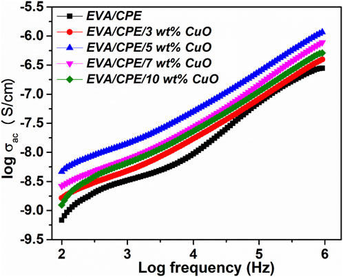 Where ω represents angular frequency, ε′ denotes dielectric constant, ε0 is the permittivity of free space and tan δ, the loss tangent (Abdelghany et al., 2023). Figure 11 shows the frequency-dependent changes in AC conductivity for EVA/CPE blend and its nanocomposites with CuO nanoparticles at room temperature. The graphs illustrate that, EVA/CPE blend has lower conductivity (2.82 × 10−7 S/cm at 106 Hz) than nanocomposites, as the intrinsically low conductivity of the polymers and their non-conductive interfaces create only a limited number of conductive paths inside the blend. The addition of nanoparticles is found to enhance σac values. The nanoparticles promote the formation of interatomic networks inside the composite, resulting in the emergence of novel electronic states which facilitate hopping of charge carriers along these pathways. The most elevated value of σac (1.16 × 10−6 S/cm) was achieved for EVA/CPE/5 wt% CuO at the maximum studied frequency of 106 Hz, which is ⁓ 4.1 times that of the pristine blend. The uniform distribution of nanoparticles at this threshold level filling leads to optimal interfacial interactions and promotes the creation of interconnected conductive networks of CuO nanoparticles within the matrix (Rajeswari et al., 2014). The reduction in AC conductivity above 5 wt% CuO nanocomposites can be ascribed to the reduction of localized sites and restricted mobility of charge carriers resulting from the aggregation of nanoparticles. For all the fabricated films, conductivity exhibits a linear increase with increasing frequency. This behaviour is due to the rising contributions of interfacial polarization and polymer-chain relaxations at elevated frequencies, and the dominance of a hopping-type conductivity mechanism in the blend composite (Rajeswari et al., 2014).