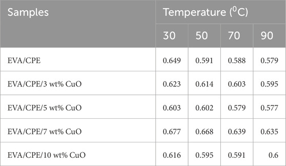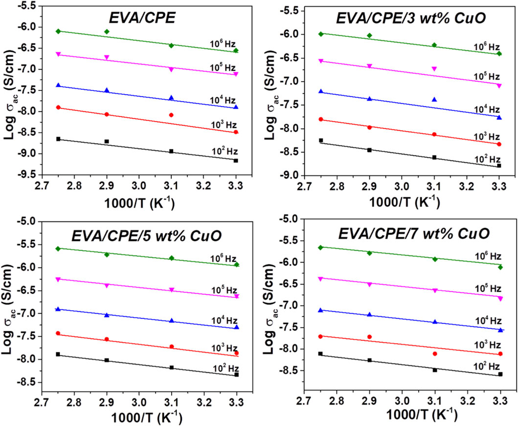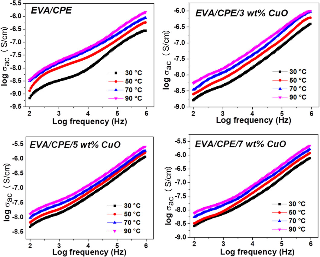 Figure 12 represents the temperature-dependent AC conductivity exhibited by EVA/CPE blend and its nanocomposites with 3–7 wt% CuO nanoparticles. It can be directly inferred from the graphs that, at any frequency, the AC conductivity of all samples increases with temperature. For example, at 106 Hz, the σac of EVA/CPE/5 wt% CuO increases from 1.16 × 10−6 S/cm to 2.884 × 10−6 S/cm as the temperature rises from 30 °C to 90 °C. The observed trend in conductivity is due to thermal excitation, which increases the segmental motion of polymer chains and enhances charge carrier mobility within the matrix. Moreover, thermal excitation enhances the number of charge carriers, resulting in an increased frequency of hopping events, which in turn contribute to conductivity (Abdelrazek et al., 2019).