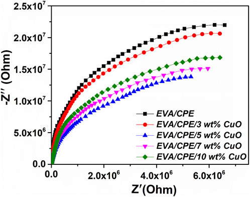 Figure 14 illustrates the room temperature Nyquist plot (Z′ versus Z″) for the EVA/CPE blend and the EVA/CPE/CuO nanocomposites. In dielectric materials, this graph typically manifests as one or more semicircular arcs, which signify the bulk effects, grain boundary effects and interfacial effects. The Nyquist plots of all studied samples display a singular incomplete semicircle, indicate that the electrical response is dominated by the bulk properties of the material. This reflects a simple equivalent circuit model featuring a resistor and a capacitor arranged in a parallel configuration. Semicircles emanating from a singular point on the Nyquist plot provide further evidence of single-phase electrical behaviour, primarily governed by bulk conduction. The bulk resistance is determined from the point where the semicircles meet the Z′ axis of the low-frequency domain. The diameter of the semicircle is found to decrease with an increase in the concentration of CuO nanoparticles, indicating a reduction in bulk resistance (Sandhya Ra et al., 2022). With an increase in the concentration of CuO nanoparticles, there is a corresponding decrease in the diameter of the semicircle, with the minimum radius observed in the EVA/CPE/5 wt% CuO nanocomposite. This indicates the lowest bulk resistance, which contributes to the improved electrical conductivity facilitated by the conductive CuO networks present in the nanocomposite.