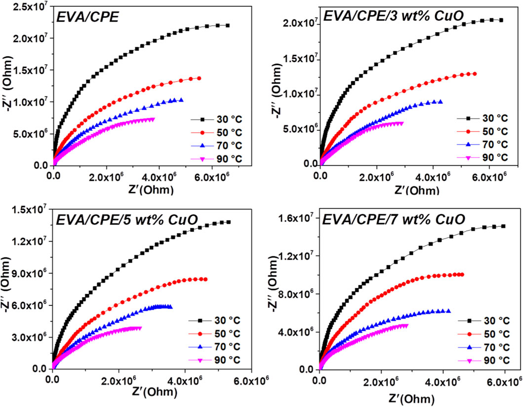 Figure 15. Nyquist plots of EVA/CPE blends and EVA/CPE/CuO nanocomposites at 30 °C, 50 °C, 70 °C and 90 °C.
