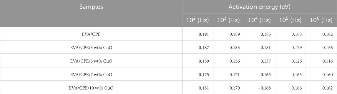 Where σ0 is the pre-exponential factor and K is the Boltzmann constant (Morsi et al., 2024). Log σac versus 1000/T plots for EVA/CPE blend and EVA/CPE/CuO nanocomposites are illustrated in Figure 13. The linear regression graphs confirm that the samples adhere to Arrhenius law. Activation energy, calculated from the slope of the plots at frequencies ranging from 102 Hz to 106 Hz is tabulated in Table 2. The data demonstrate that the activation energy diminishes as the nanoparticle content increases, attaining its minimum at the 5 wt% sample. The decreased activation energy indicates increased electrical conductivity. The homogeneous distribution of nanoparticles at this concentration enhances the effective hopping of charge carriers between localized states, thus promoting superior charge transport inside the composite (El, 2020). At CuO loadings above 5 wt%, nanoparticle agglomeration impede electron hopping, leading to higher sactivation energy.