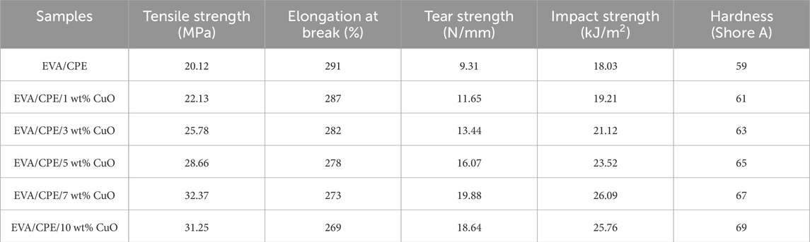 The structural characterisation of EVA/CPE blend and EVA/CPE/CuO nanocomposites was carried out using a JASCO 4100 FTIR spectrometer. The XRD patterns of the films were obtained by the X’Pert3 diffractometer with Cu-Kα radiation at 2θ ranging from 10° to 90°, at a scanning rate of 2°/min. A JASCO V-770 spectrophotometer was used to analyze the optical properties of the fabricated films. The influence of CuO nanoparticles on the surface morphology of the samples was investigated using a Carl Zeiss FE-SEM, VP500. HR-TEM was used to determine the atomic-level distribution of CuO in the EVA/CPE matrix using the JEOL JEM 2100. The evaluation of thermal stability was conducted using a Hitachi STA7200 TGA at a scanning rate of 10 °C/min under N2 atmosphere. The AC conductivity, electric modulus, impedance, and dielectric constant were measured using a HIOKI 3570 impedance tester. Tensile strength and elongation at break were measured following ASTM D412, and tear strength was evaluated in accordance with ASTM D624, using a Zwick universal testing machine. The Izod impact strength analysis of the nanocomposites was conducted using a Zwick 5102 impact tester (ASTM D256). The Shore A durometer was used to assess the hardness of the nanocomposites following the ASTM D2240 standard.
