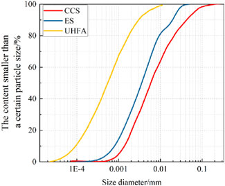Figure 2. Particle-size distribution curves for the expansive soil (ES), ultrafine high-reactivity fly ash (UHFA), and calcium carbide slag (CCS).