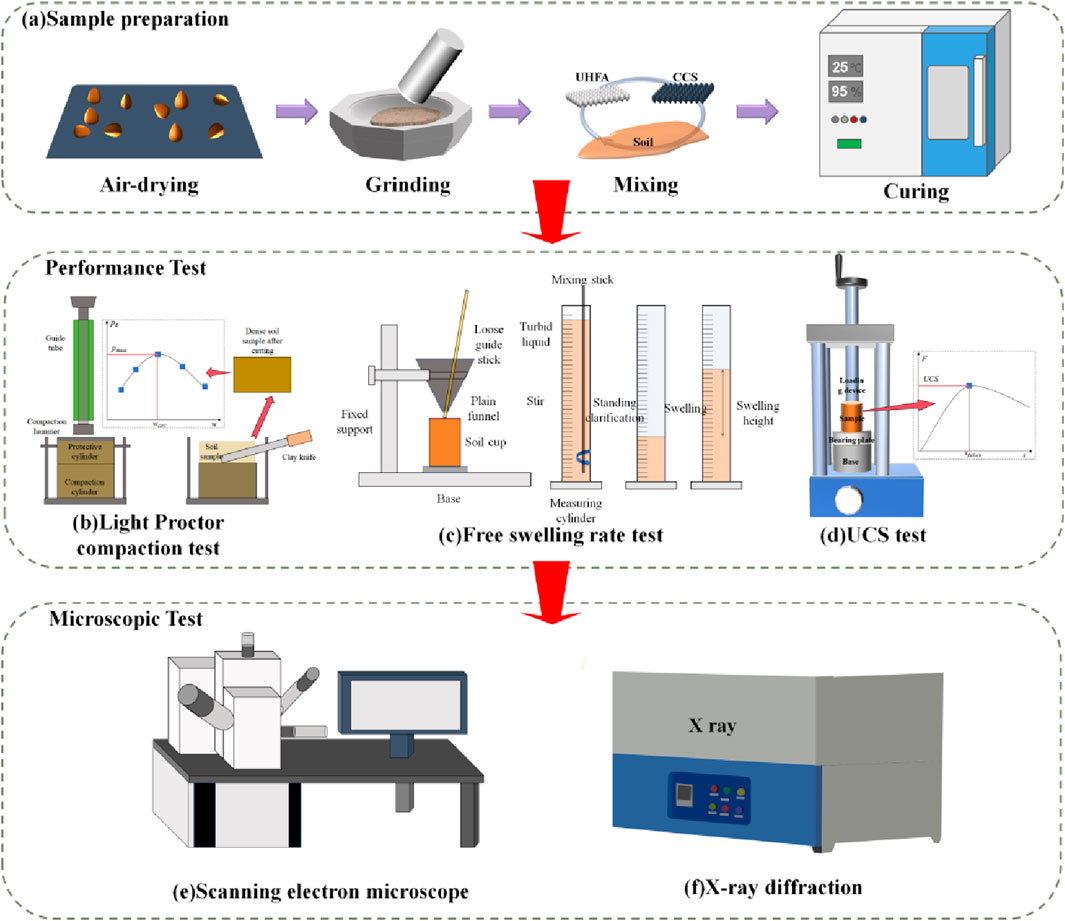 Figure 3. The experimental procedure: (a) Sample preparation (b) Light Proctor compaction test (c) Free swelling rate test (d) UCS test (e) Scanning electron microscope (f) X-ray diffraction.