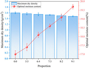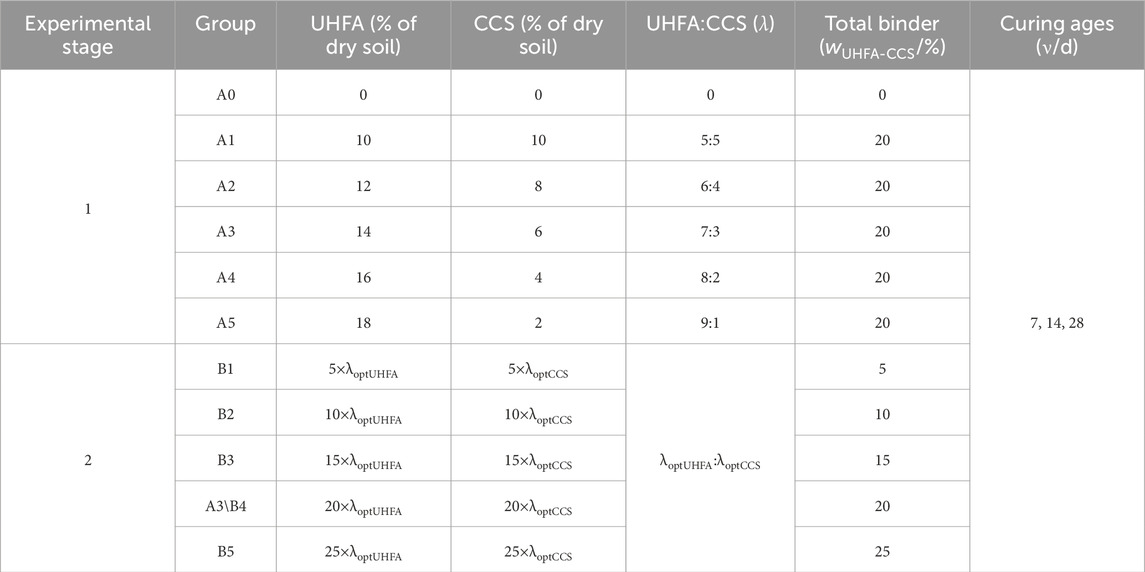 A two-stage program decoupled the influence of binder proportion from total dosage. In Stage I, the total binder content (UHFA + CCS) was fixed at 20% of dry soil, while the UHFA:CCS mass ratio λ was varied to identify an optimal proportion (λopt). In Stage II, the proportion was fixed at λopt and the total binder dosage wUHFA–CCS was set to 5%, 10%, 15%, 20%, and 25% of dry soil. The range of binder ratios (5:5 to 9:1) and total dosages (5%–25%) was selected based on a review of relevant literature on soil stabilization and the results of preliminary laboratory trials to ensure the optimal formulation would be captured within the experimental design.