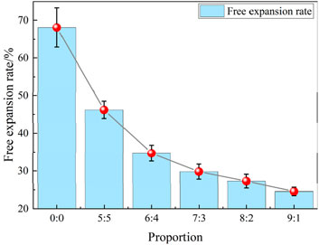 A second, equally important pathway is the reduction of swelling potential through cation exchange. Expansive clays contain interlayer and diffuse-double-layer monovalent cations such as Na+ and K+, which have high hydration energies. Calcium ions released from CCS displace these monovalent cations, yielding Ca-saturated clay with a lower hydration tendency and a thinner diffuse double layer (Equation 7). This exchange reduces interparticle repulsion and facilitates flocculation, thereby suppressing macroscopic free swell. The monotonic decrease of the 28-day free swelling rate directly reflects this ion-exchange-driven double-layer compression acting in concert with gel formation.
