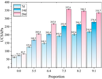 1. The optimal mass ratio of UHFA to CCS was determined to be 7:3. This specific proportion achieves a superior balance between short-term workability and long-term performance, effectively suppressing the soil’s swelling potential while facilitating the highest 28-day unconfined compressive strength (UCS) compared to other ratios. Ratios with higher UHFA content showed accelerated early strength gain but were ultimately limited by the insufficient alkaline activation from CCS for sustained pozzolanic reactions.