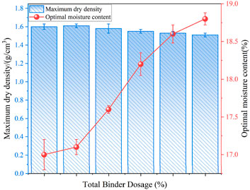 From an engineering and economic perspective, the concept of marginal return is critical in selecting the appropriate binder content. The increase in 28-day strength from a 10% to a 15% dosage is a substantial 51.2 kPa. In contrast, increasing the dosage from 15% to 25% not only requires 10% more material but also results in a net decrease in strength of 13.5 kPa. This clearly indicates that dosages exceeding 15% are not cost-effective and may even be counterproductive to achieving maximum strength. This phenomenon aligns with the general principle in soil stabilization that an optimal binder content exists, beyond which the benefits are outweighed by increased material costs and potential negative impacts on the microstructure. Therefore, considering the balance between mechanical performance, material expenditure, and the associated effects on compaction properties, a 15% total binder content is identified as the optimal and most efficient dosage, providing a technically sound and economically viable solution for the engineering application of this stabilization technique.