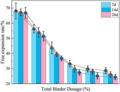 This time-dependent behavior demonstrates that increasing the UHFA-CCS binder content accelerates and intensifies the swell suppression mechanisms. At higher dosages, a more extensive and dense network of cementitious products (C-S-H and C-A-H gels) forms rapidly throughout the soil matrix. This network provides a dual function: it physically restrains the clay particles, and it fills and refines the pore structure, thereby obstructing the migratory pathways of water to the expansive mineral surfaces. As curing progresses, these pozzolanic reactions continue, further solidifying the soil fabric and leading to the observed continued decrease in Free swelling rate over time. However, from a practical standpoint, an optimal dosage must balance performance with economic and engineering efficiency. While the 20% and 25% dosages provide the best swell control, the 15% dosage also achieves a non-expansive state at later curing ages and may be sufficient for many engineering applications. Considering the previous compaction and strength test results, a dosage of 15%–20% is identified as the optimal range, as it effectively reduces swell potential to acceptable levels while maintaining high long-term strength and balancing material costs, thus representing the most pragmatic and cost-effective solution.