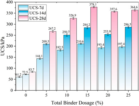 where UCSw is the unconfined compressive strength (UCS) at a given binder dosage percentage w, and UCS0 is the UCS of the untreated soil. is the UCS of the untreated soil (83.7 kPa).
