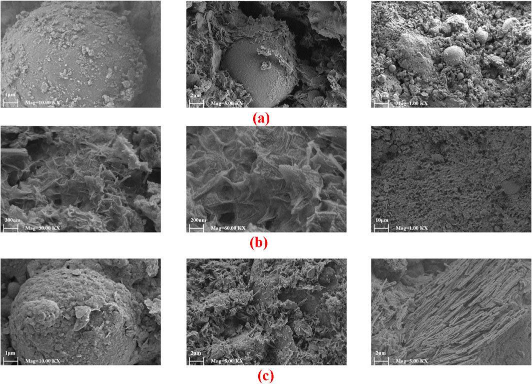 Figure 10. Scanning electron microscopy results. (a) Typical microstructure of stabilized soil specimen at a total binder dosage of 5% (b) Typical microstructure of stabilized soil specimen at a total binder dosage of 15% (c) Typical microstructure of stabilized soil specimen at a total binder dosage of 25%.
