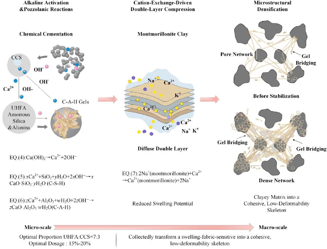 4. The stabilization is governed by a dual chemical and microstructural mechanism. The high alkalinity of CCS activates the pozzolanic reactivity of UHFA, leading to the formation of calcium silicate hydrate (C-S-H) and calcium aluminate hydrate (C-A-H) gels. These hydration products fill voids and bind soil particles into a dense, rigid skeleton, as confirmed by SEM observations. Simultaneously, Ca2+ ions released from CCS facilitate cation exchange, which compresses the diffuse double layer of clay particles and reduces their affinity for water, thus effectively controlling swelling.