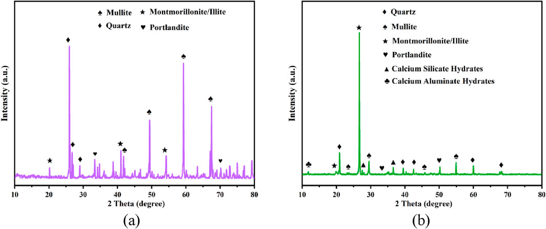 These chemical interpretations are directly substantiated by mineralogical analysis. Figure 12a presents the X-ray diffraction (XRD) pattern of the untreated expansive soil, where the primary crystalline phases are identified as common soil minerals, including Quartz and Illite. As expected, no peaks corresponding to cementitious hydration products are present. In stark contrast, the XRD pattern of the soil stabilized with a 15% UHFA-CCS binder (cured for 28 days), shown in Figure 12b, reveals the formation of new crystalline and semi-crystalline phases. While the characteristic peaks of the original soil minerals (e.g., Quartz, Illite/Montmorillonite) persist, distinct new peaks identified as Calcium Silicate Hydrates (C-S-H) and Calcium Aluminate Hydrates (C-A-H) have appeared. The emergence of these new C-S-H and C-A-H peaks provides definitive proof of the pozzolanic reactions described in Equations 5 and 6, confirming that these new binding gels are the fundamental source of the observed strength gain.