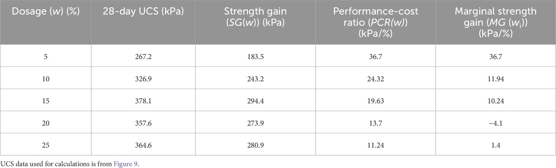 Second is the Performance-Cost Ratio (PCR(w)) in Equation 2, which evaluates the average return on investment. For this analysis, the binder dosage percentage (w) is used as a direct proxy for the material cost, an assumption that facilitates a technical comparison of efficiency: