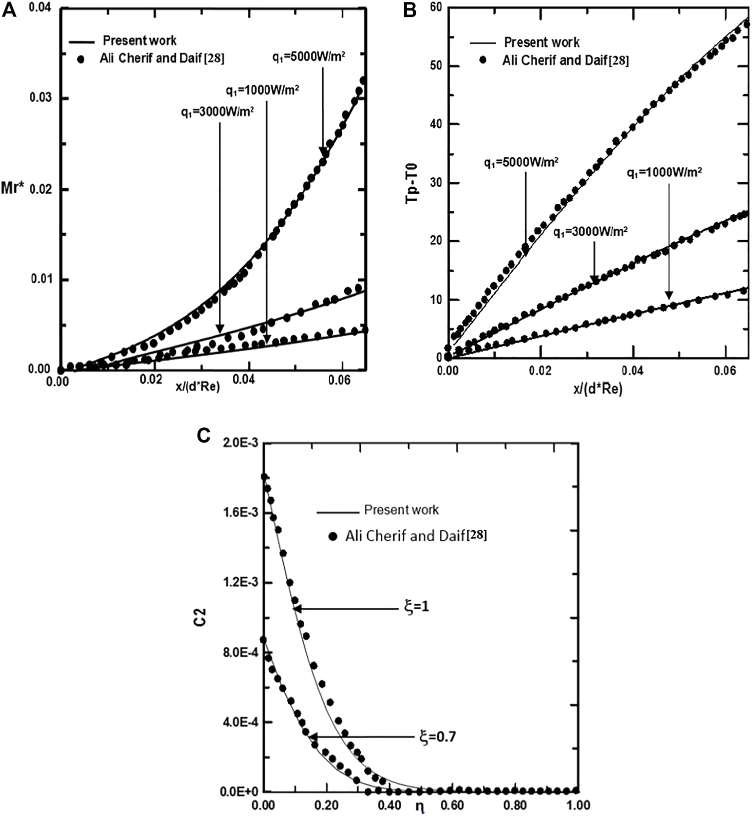 To check the adequacy of the numerical scheme adopted in the present study, the procedure has been tested by comparing the total evaporating rate (Mr), the interfacial temperature (Tp-T0) and the concentration of ethylene glycol vapour calculated from the present code with the results of Ali Cherif (Ali and Daif, 1999) for the case of the evaporation of the binary (water-ethylene glycol) liquid film flowing down on one plate of the vertical channel (see Figures 2A–C). The first plate of a vertical channel is wetted by the binary liquid film and externally subjected to a uniform heated flux q1 while the second (y = d) is dry and adiabatic. The comparison has been done for T0 = 293.15K, c01 = c02 = 0, T0L = 293.15K, q2 = 0,