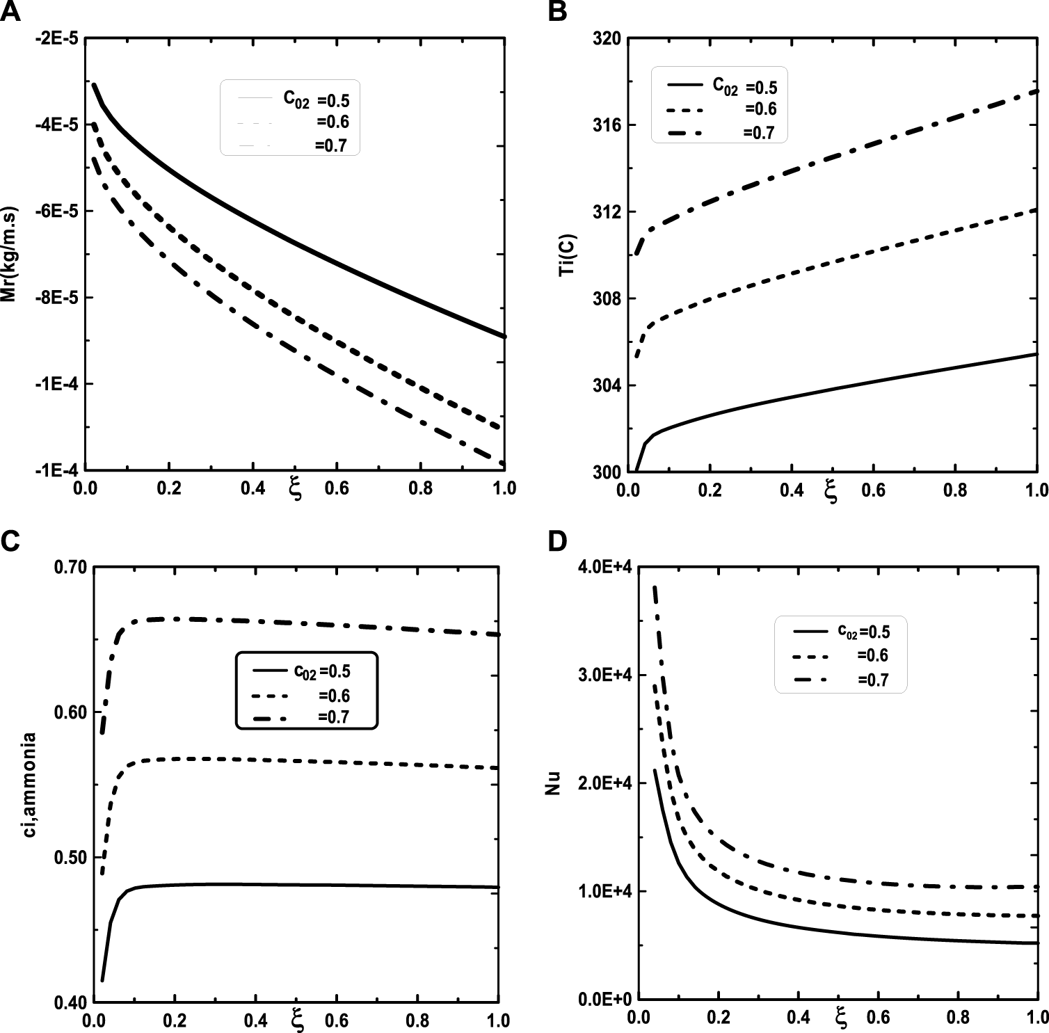 FIGURE 5. Effect of the inlet vapor concentration of ammonia c02 on the cumulated condensation rate of vapors mixture (A), the interfacial temperature (B), the ammonia vapor concentration (C) and the Nusselt number (D): c01 = 0.3, T0L = 10°C, T0 = 20°C, Tw = 20°C, q1 = 0, m0L = 0.001 kg/m.s, cLiq, ammonia = 0.5 (50% water-ammonia mixture).