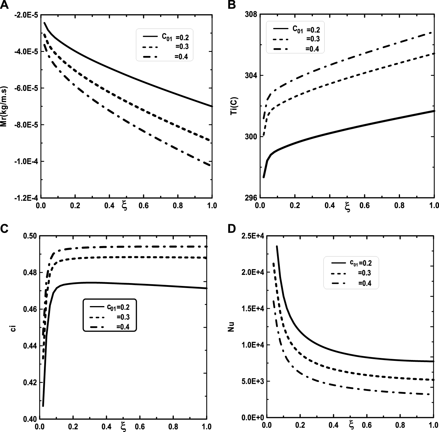 FIGURE 6. Effect of the inlet vapor concentration of water c01 on the cumulated condensation rate of vapors mixture (A), the interfacial temperature (B), the ammonia vapor concentration (C) and the Nusselt number (D): c02 = 0.5, T0L = 10°C, T0 = 20°C, Tw = 20°C, q1 = 0, m0L = 0.001 kg/m.s, cLiq, ammonia = 0.5 (50% water-ammonia mixture).
