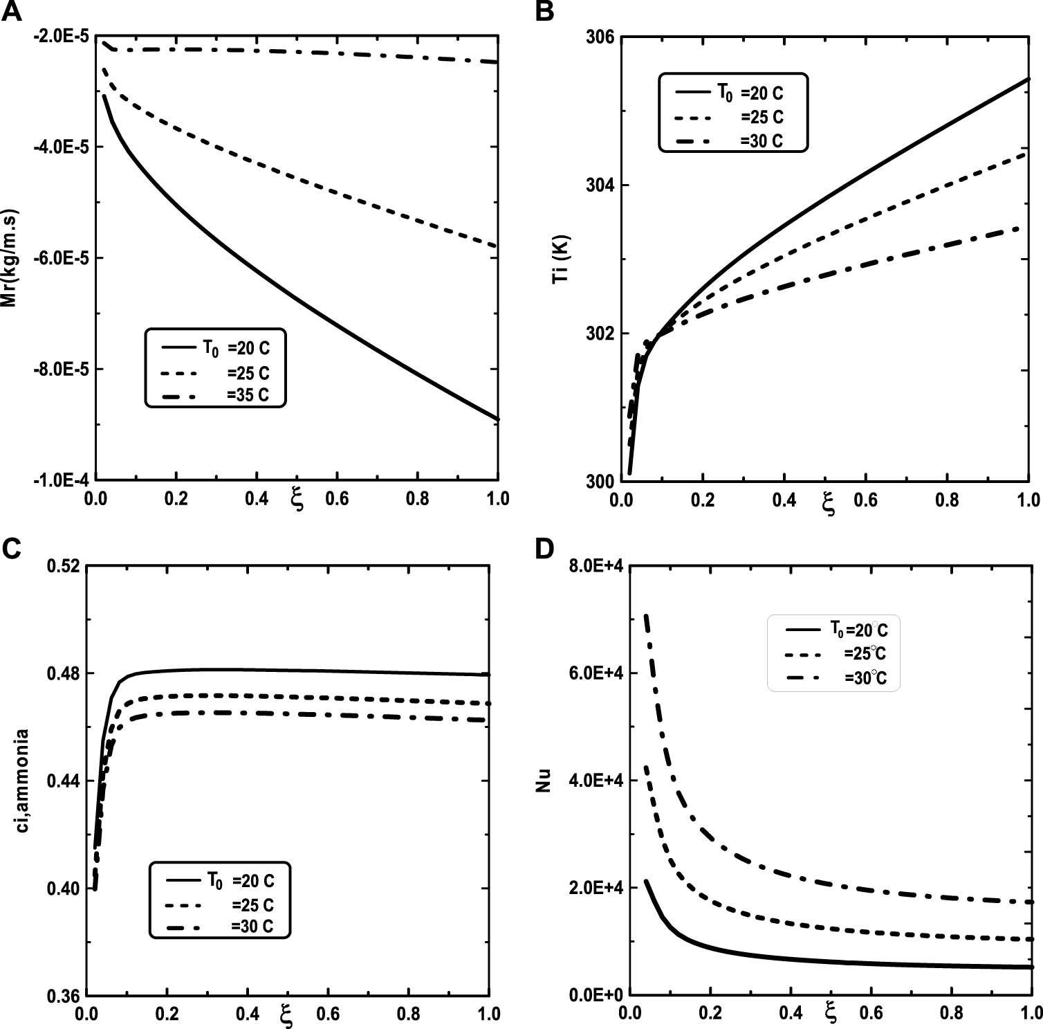 FIGURE 7. Effect of the inlet gas temperature T0 on the cumulated condensation rate of vapors mixture (A), the interfacial temperature (B), the ammonia vapor concentration (C) and the Nusselt number (D): c01 = 0.3, c02 = 0.5, T0L = 10°C, Tw = 20°C, q1 = 0, m0L = 0.001 kg/m.s, cLiq, ammonia = 0.5 (50% water-ammonia mixture).