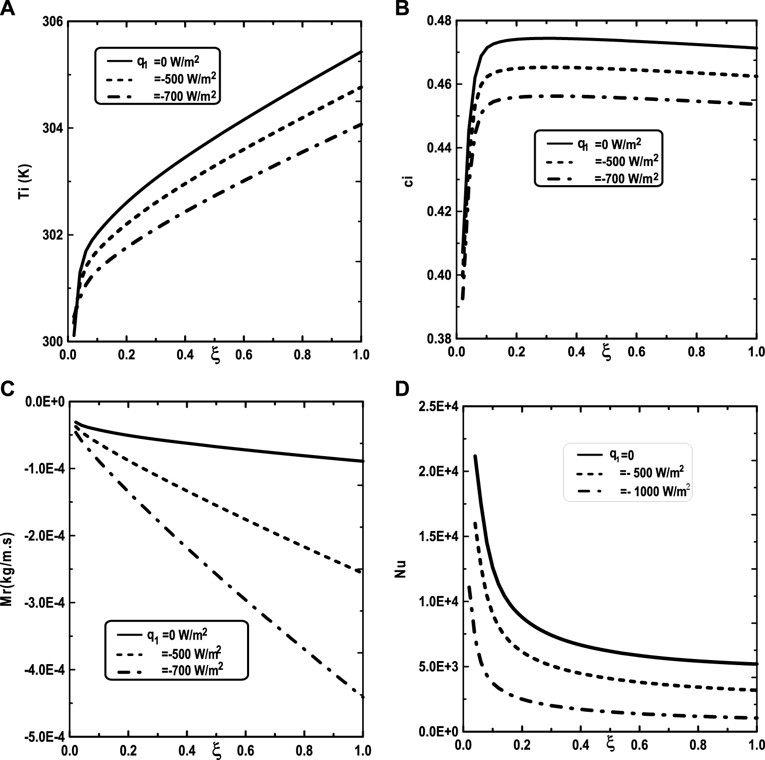 FIGURE 8. Effect of the heat flux q1 on the cumulated condensation rate of vapors mixture (A), the interfacial temperature (B), the ammonia vapor concentration (C) and the Nusselt number (D): c01 = 0.3, c02 = 0.5, T0L = 10°C, Tw = 20°C, T0 = 20°C, m0L = 0.001 kg/m.s, cLiq, ammonia = 0.5 (50% water-ammonia mixture).