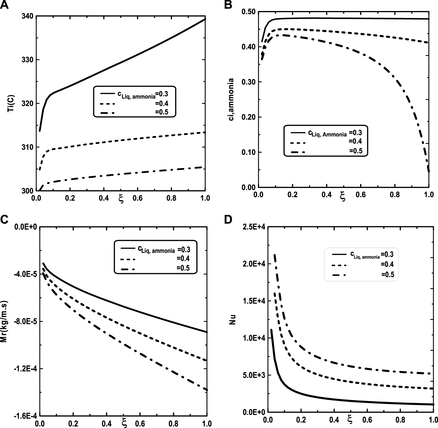 FIGURE 9. Effect of inlet liquid concentration of ammonia c1Liq, ammonia on the interfacial temperature (A), the ammonia vapor concentration (B), the cumulated condensation rate of vapors mixture (C) and the Nusselt number (D): c01 = 0.3, c02 = 0.5, q1 = 0, T0L = 10°C, Tw = 20°C, T0 = 20°C, m0L = 0.001 kg/m.s.