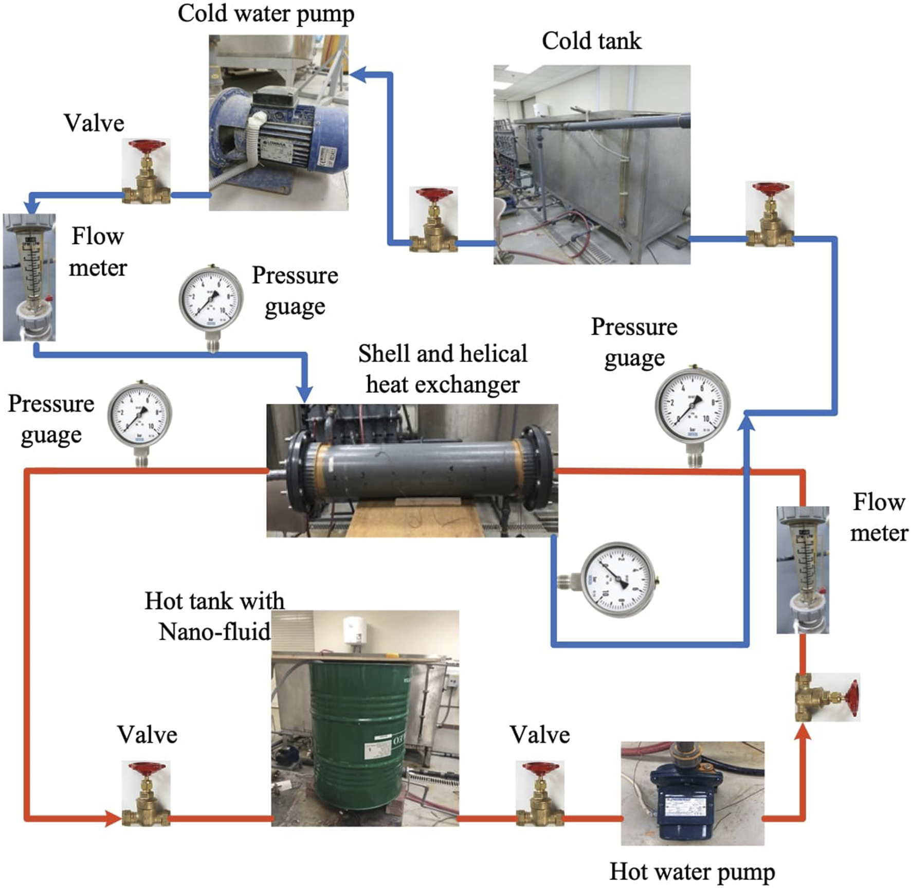 Experiments are carried out with tap hot and cold water without nanoparticles; after recording the data, Different particle concentrations of nano-fluid (0.15%–0.75%) has been prepared by adding nano-particle to the hot water tank and mixing it properly, then experiments are performed again to record the required date. Finally, data from all experiments are analyzed and matched to show the impact of adding nanoparticles in enhancing heat transmission. Figure 2 depicts the geometry of the considered shell and helically coiled tube heat exchanger. The dimensional parameters of the heat exchanger, such as the internal and external diameters of the tube and the shell, are presented.