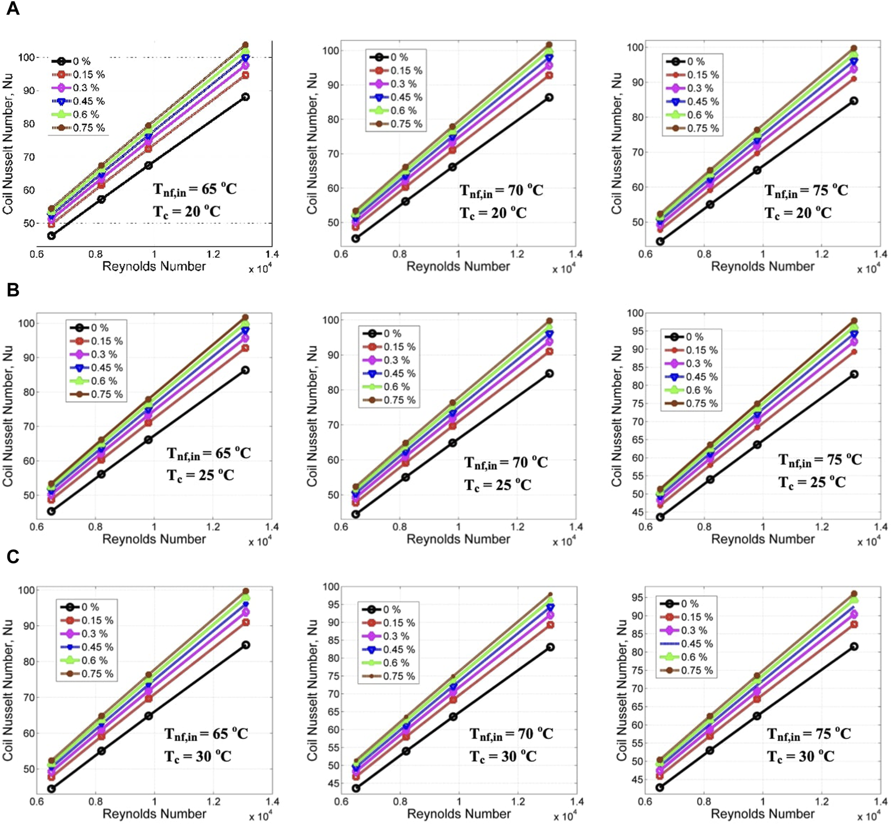 Figure 3 displays the effects of nanofluid concentration and the Reynolds number on the average Nusselt number with mass flow rate of 0.2 kg/s cooling water at the shell side and for different inlet temperatures of the hot nano-fluid, which are 65°C, 70°C, and 75°C; while the temperature of the cooling water kept at the value of 20°C. The nano-fluid mix has a considerable consequence on the average Nusselt-number; raising the particle concentration tended to increase the Nusselt-number meaningfully. The increase in average Nusselt number of the hot water in the coil increases by around 17.8% due to addition of 0.75% Al2O3 nano-particle.