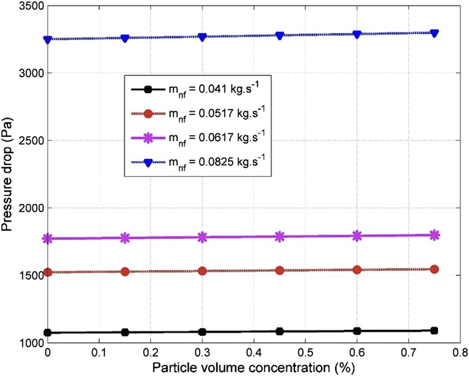 Figure 4 shows the effect of particle concentration to drop in pressure of the nano-fluid. The figures shows the drop in pressure for 70°C entrance temperature of the nano-fluid, and 25°C inlet temperature of the cold water at the shell side. The particle concentration is varied from 0% to 0.75%. The flow rate of the cooling water kept at 0.2 kg s-1, while flow rate of the nano-fluid increased from 0.041 kg s-1 to 0.0825 kg s-1. Generally, there is a slight increase in drop in pressure due to increase in particle concentration for all considered flow rate of the nano-fluid. Up to 1.5% increase in drop in pressure is observed due to increase in nano particle concentration. However, the pressure drop of the nano-fluid with rise in flow rate is significant.