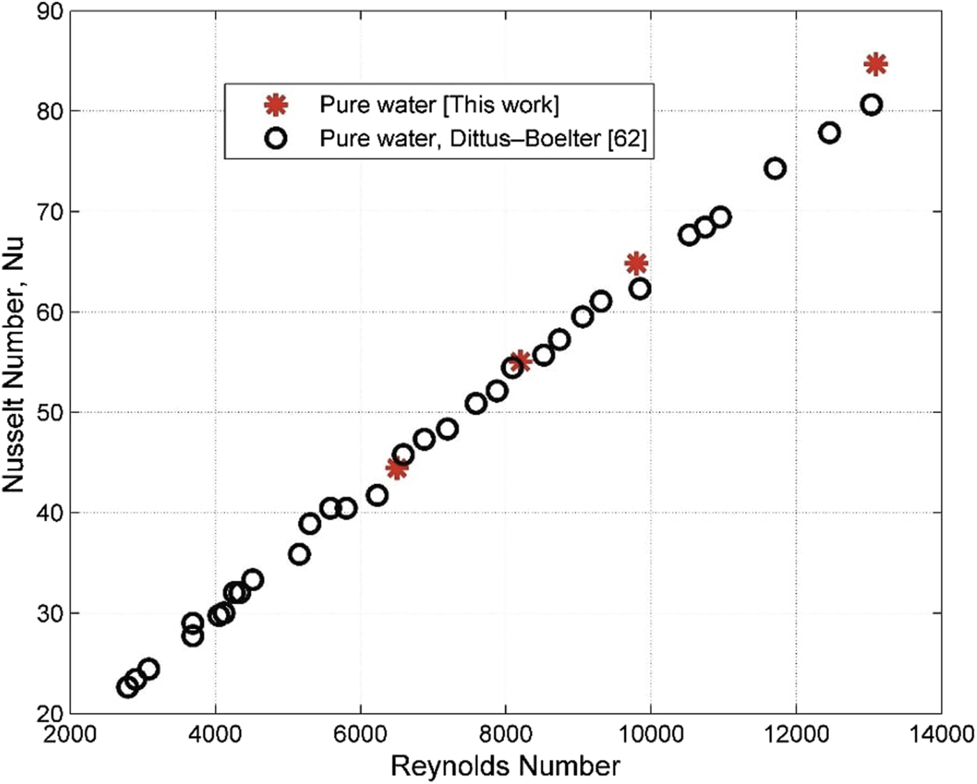 Figure 7 presents a comparison of this work against Dittus–Boelter data. The Dittus–Boelter data represent the Nusselt number’s relation with the Reynolds number of pure water in a straight tube. The comparison shows that the results of this study are close to the Dittus–Boelter data. Although the Dittus–Boelter data represent the relationship between the Nusselt number and the Reynolds number of pure water in a straight tube, it can be used to compare experimental results of flow in a helically coiled tube in many literature sources (Hardik et al., 2015).