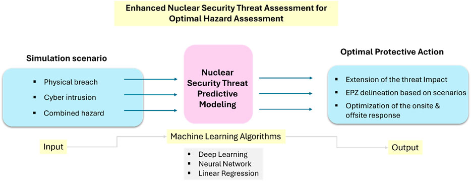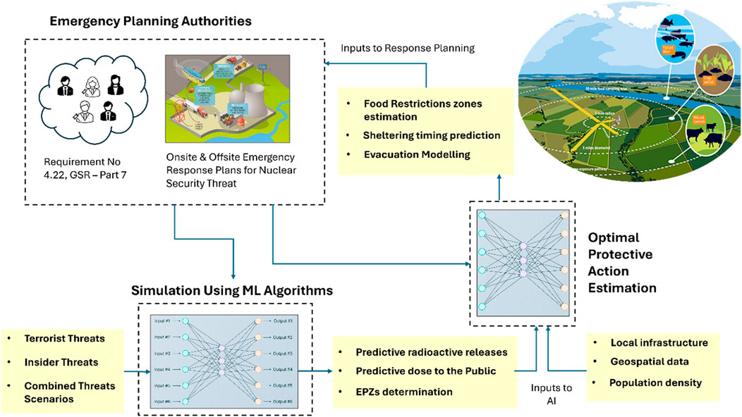 By running the simulation codes, the emergency planners can assess the impact of such type of attack on the nuclear power plant and they will be able to determine the extent of the emergency planning zones (EPZs) according to the simulation results from the ML algorithms. These algorithms, such as Deep Learning (DL) (Chernavskikh, 2024) hold a significance simulation and scenario reconstruction capabilities (NNSA, 2023) that can optimize the extension of the EPZs and therefore optimize the protective action and the emergency response plans onsite and offsite the plant. In his paper, NNSA (2023) states that since 1992, the National Nuclear Security Administration (NNSA) of the United States has undergone different testing for artificial intelligence integration for nuclear security purposes, to detect and identify any potential threat through prediction algorithm and simulate different nuclear security threat scenarios through and an advanced program called Advanced Simulation and Computing (ASC) program. In the same paper, NNSA (2023) affirms that in 2023, this simulation program ASC has reached unique modeling and simulation capabilities that use extensive machine learning tools allowing the simulator to mimic the nuclear security attack which high accuracy (NNSA, 2023), which will result in high accuracy in predicting the impact of this attack, thus more effective protective action planning strategy. Therefore, AI can be applied in EPR during the hazard assessment phase to address Requirement number 4.22 in the GSR-Part 7 (IAEA, 2015) to include nuclear security threat assessment in the hazard assessment, and it can simulate different nuclear security threat scenarios to assess the extension of their potential impacts on the public. The concept of applying AI in predictive modeling in nuclear security threat assessment is illustrated in Figures 1, 2.