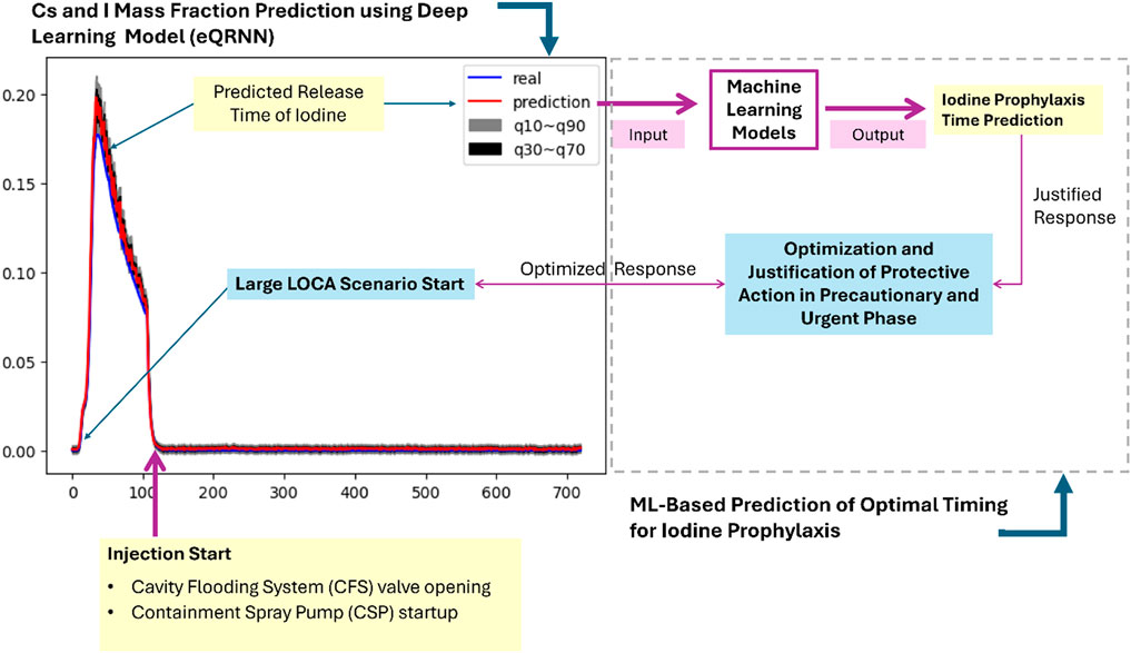 Following nuclear accident, the World Health Organization (WHO) recommends iodine prophylaxis for children, adolescent and pregnant women, and restrict it for persons over 45 years (Portius, 2013). The dosage of the stable iodine and the distribution radius of the tablets depends on the released quantity of the radioactive iodine from the NPP (Portius, 2013), thus optimizing the planning radius for the distribution of the iodine tablets is crucial in the preparedness phase to ensure that the iodine tablet are distributed to the affected member of public. The Chernobyl accident has proven that radioactive iodine I-131 released in a nuclear accident can trigger cancerous thyroid nodules to develop in young population that is located within a 300 mile radius of the nuclear accident (Braverman et al., 2014). Additionally, timely potassium iodide (KI) management can avoid the progress of thyroid cancer (Braverman et al., 2014), and as the iodine prophylaxis has effect only less than 24 h prior to the release and up to 2 h after the exposure to radioactive iodine (Paladino, 2022), it is important to predict accurately the release time and quantity so that the stable iodine can be taken by the public at the right time. Artificial intelligence can be employed for this purpose to monitor the critical nuclear power plant data and detect any anomalies in these data to predict the failure of the system thus the release quantity and timing. In his paper, Jendoubi and Asad (2024) explained how machine learning algorithms such as ANN are able to predict the nuclear releases based on comparison between the measured NPP data and the forecasted data from the neural network. Another Yang et al. (2024) used DL models such as Conventional Transformer (ConvTran) for rapid diagnosis and prediction of the radioactive Cs and I release during large Loss of Coolant Accident (LOCA).