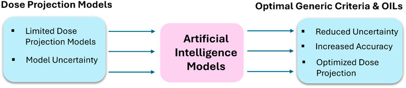Generic criteria and OILs are tools to assist EPR authorities when planning protection strategies for nuclear emergency (Health Canada, 2018). The generic criteria are conveyed as dose levels over a specified time interval which, when surpassed, indicate that protective actions and accompanying response actions are warranted (Health Canada, 2018). The OIL intervention levels are instead employed after the release to adjust the execution of protective actions based on monitoring data measurements (Health Canada, 2018). The generic criteria and the OILs are used to develop protective action that are optimized and justified on the basis of the identified hazards as required by the IAEA (Requirement 5) (IAEA, 2015). The generic criteria are based upon the projected dose and the received dose, which are based on code and simulation modelling. Artificial intelligence can play a pivotal role in strengthening the accuracy and the stability of these models which will result in optimized generic criteria, thus effective emergency protective strategies, as modelled in Figure 4. The existing simulation models used for dose projections to develop the generic criteria contain uncertainties (Warner, 2023), however, is these models are enhanced using machine learning algorithm, the uncertainties levels decrease considerably. In his paper, Tyralis (2024) explores the benefit of Random Forest and DL algorithms in quantifying and filtering the uncertainties associated with the modeling and the simulation spatial and temporal models, which are very similar to the release of radioactivity models during nuclear emergency that evolve over the time and over the space.