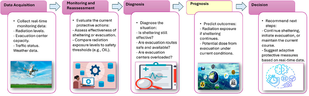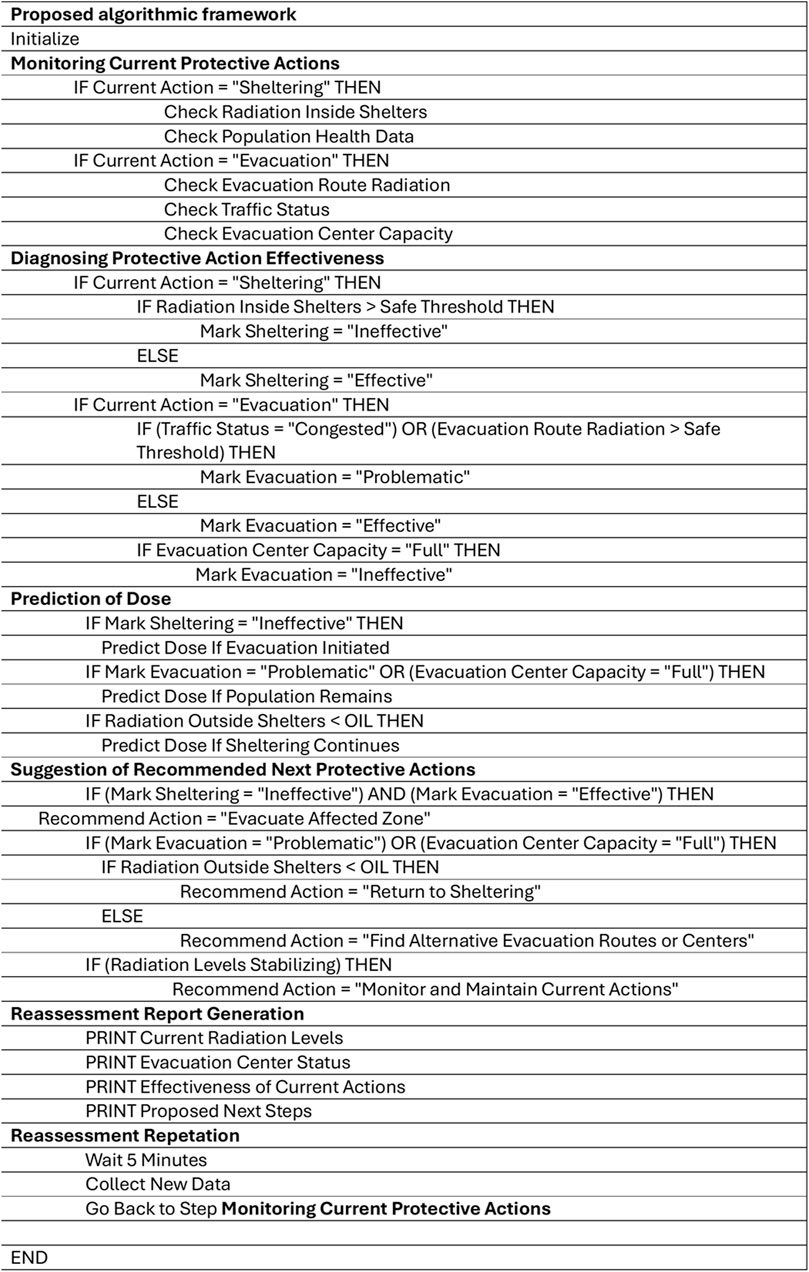 Actual emergency situations do not necessarily follow the planned scenario patterns. The existing emergency circumstances sometimes deviate from the assumption made during the preparedness phase. For these reasons, the preplanning strategies should include different emergency scenarios and implement different contingencies to ensure the efficacy of the protective actions. Furthermore, as the emergency evolve, there is a need to reassess the effectiveness of certain protective action. For instance, the reassessment of “sheltering” as protective action taken according to the planned response may reveal the inefficacity of sheltering people in place while the radioactivity levels are increasing and consequently the dose rate is increasing. Therefore, the revaluation of the “Sheltering” as protective action would result in more effective action in the existing emergency circumstances such as “Evacuation”. In this paper we are proposing a novel idea to automate the reassessment process of the nuclear emergency using Artificial Intelligence. This intelligent reassessment would use ML and DL algorithms to assess how the situation is evolving and suggest different protective actions as the emergency situation progress. This novel idea is modelled in a simplified algorithmic framework as shown in Figure 5. The proposed algorithm includes seven input data, “Radiation Outside Shelters”, “Radiation Inside Shelter”, Evacuation Route Radiation”, “Evacuation Center Capacity”, “Traffic Status”, “OIL Value” and “Population Health Data”. This algorithm aims to monitor the current protective action, diagnose it and compare it with the OIL values (IAEA, 2017), the evacuation center capacity, dose values in evacuation route, and the public health data coming from hospitals and medical points. After that, the proposed algorithms predict the safety and the effectiveness of the current protective action based on the previous comparison and suggest the recommended next protective action or it can suggest continuing to use the current protective action. The algorithm will also collect the data every 5 min, as a conservative assumption, and repeat the assessment. In essence, the proposed novel idea of intelligent reassessment of protective action effectiveness during nuclear emergencies would dynamically adjust the next protective action recommendation based radiation levels and the available resource to ensure that the taken protective actions are working well, as modelled in Figure 6.