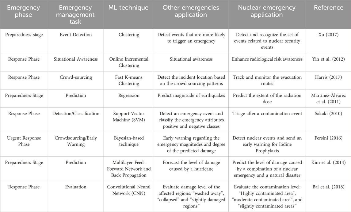 Network (CNN) to train the AI model based on pixels images from radar Earth observation satellite in the purpose to evaluate damage level of the affected regions, the output from the AI models was instant evaluation and classification of the damaged area into the following categories “washed away”, “collapsed” and “slightly damaged regions”. In our case we can use this CNN technique to evaluate the contamination level after a severe nuclear accident and classify the affected area in “Highly contaminated area”, “moderate contaminated area”, and “slightly contaminated areas”. This is very important, because during the evacuation process, it is crucial to determine the non-contaminated route to make sure the evacuation is done safely. The following Table 1 summarizes the machine learning techniques reviewed in this section.