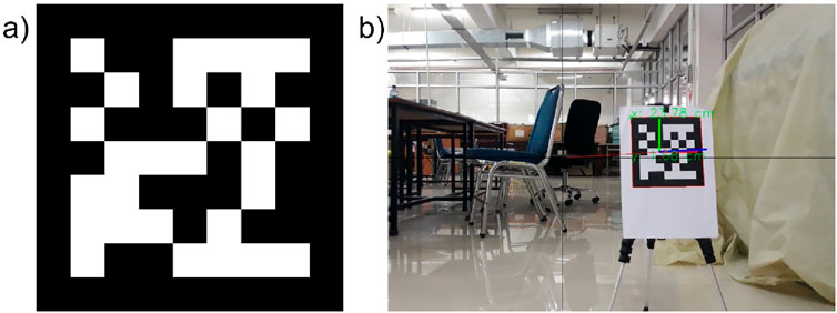 To perform position measurements using ArUco markers, a marker detection program was developed using the Python programming language and the OpenCV library, which includes features such as camera access, image processing, and the ArUco algorithm (Rosebrock, 2024). The markers used are of the 7 × 7 250 type, as shown in Figure 5a, printed on a paper with dimensions of 16 cm × 16 cm. Additionally, Figure 5b shows the photo of the marker in the experiment setting.