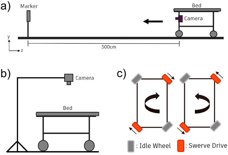 Figure 7. Schematics of experimental setups, (a) Straight motion experiment setup, (b) Rotational motion experimental setup, and (c) Diagrams of rotational directions of the swerve drive modules during bed’s clockwise and counterclockwise motions.