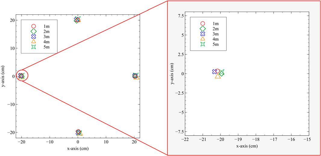 Tables 1, 2, 3 above display the measurement values for each marker, starting with marker 1, which is positioned at the origin, followed by marker 2 to the right of the origin, marker 3 below the origin, and marker 4 to the left of the origin. The recorded values represent readings for each axis. It is evident that the measurement differences between markers at various distances are relatively minor, with an average measurement accuracy difference of 0.1 cm. This data is further illustrated in the graph shown in Figure 8 below. The experimental results indicate that the readings for each marker at distances ranging from 1 to 5 m demonstrate good accuracy, with an average measurement difference of 0.12 cm.