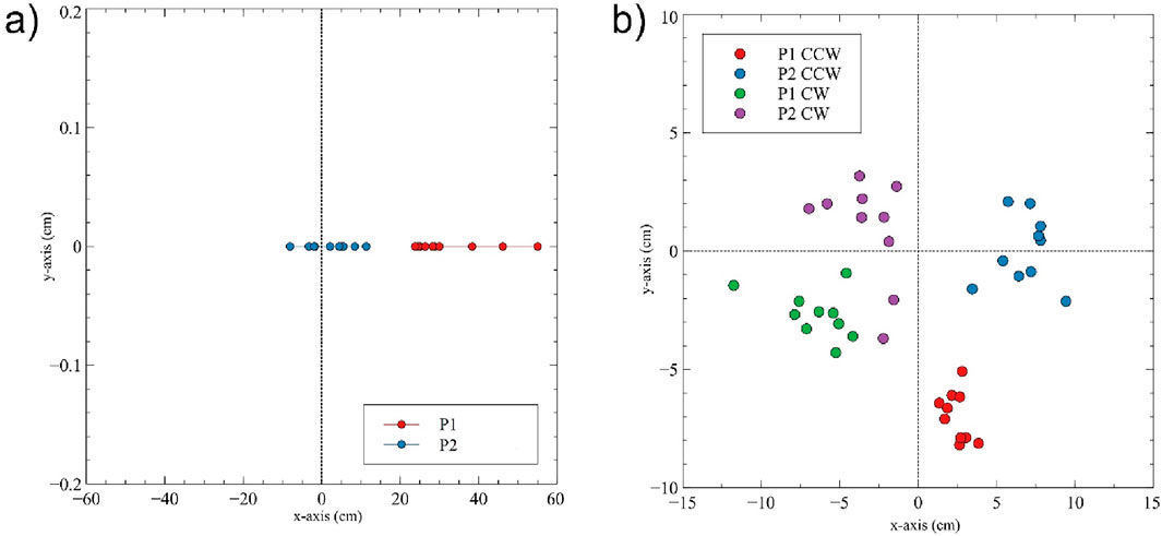 When examining each axis, Prototype 2 performs significantly better along the y-axis, with data points closer to zero, while both prototypes have similar deviation values on the x-axis. The average deviation values for Prototype 1 and 2 are shown in Table 4, focusing only on CW rotation to avoid confusion. The deviation for rotational motion is defined as the Euclidian distance from the ideal center, i.e., the origin (0,0). The average deviation for clockwise (CW) rotation indicates that Prototype 2 outperforms Prototype 1, with a t-test result of t = 3.91 and a p-value <0.00356. The average deviation for CW rotation decreased from 7.16 cm to 4.07 cm.