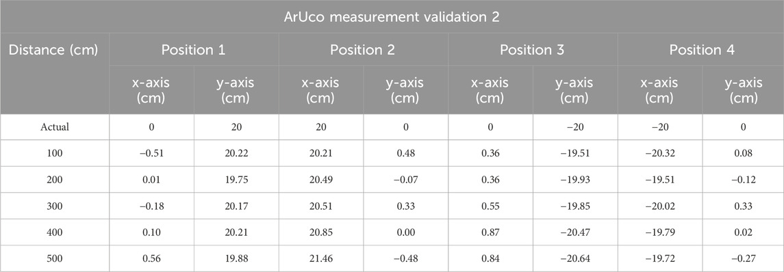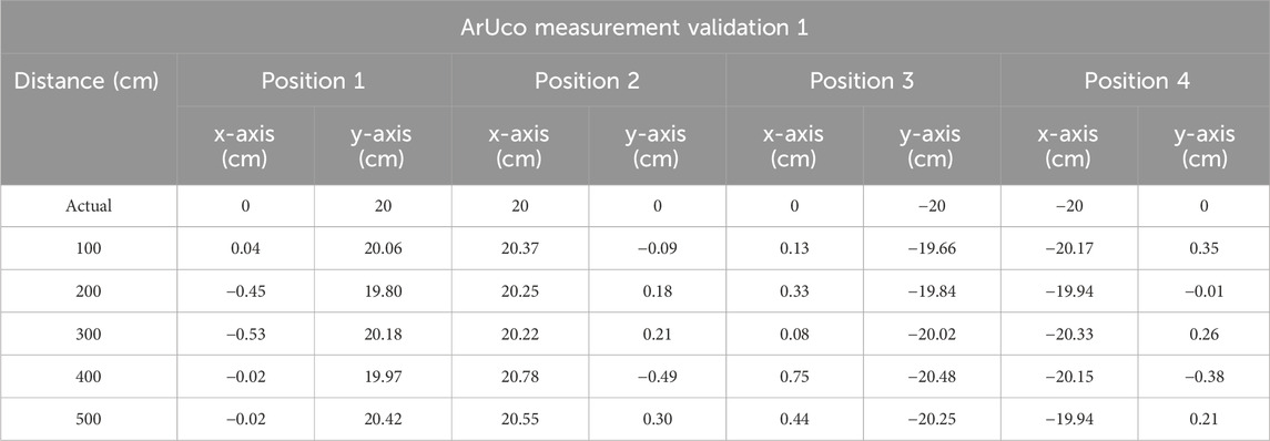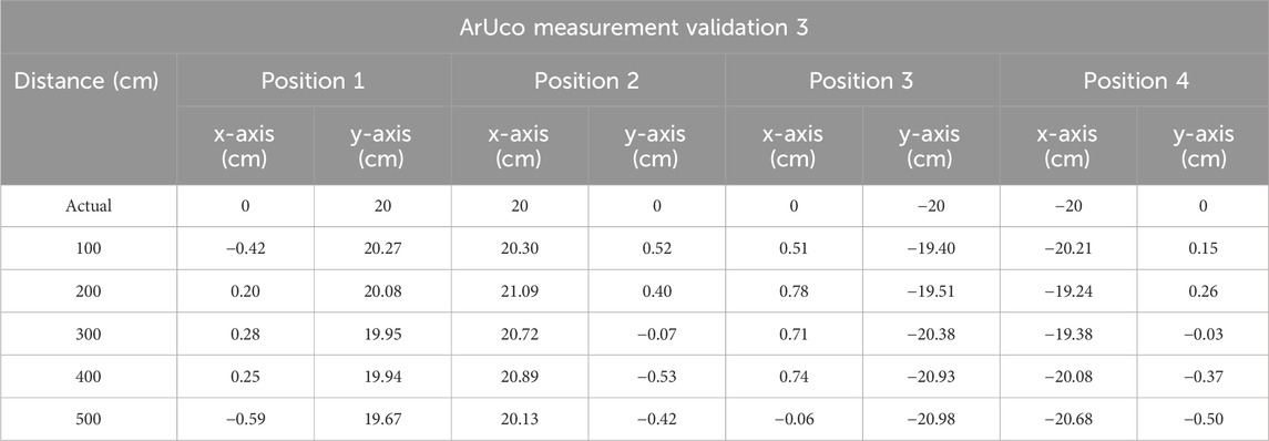 The marker measurement process was repeated three times, with measurements taken first from position 1–5 m and then from 5 to 1 m. The camera was manually repositioned to assess how random changes affected the results. The results are tabulated in Tables 1, 2, 3.