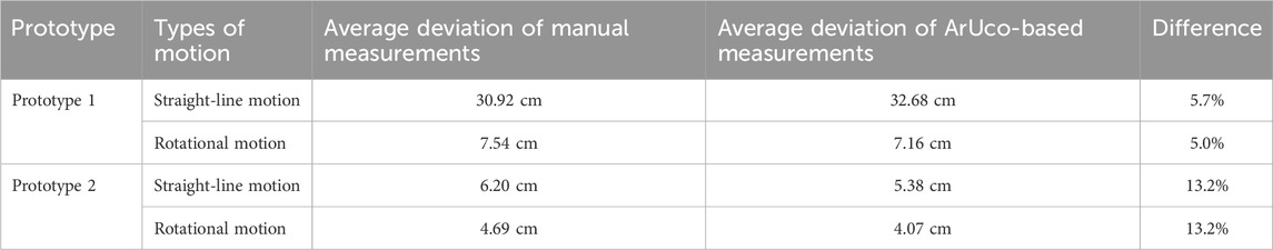 Table 4. Tabulated results comparing average deviation values of manual and ArUco-based measurements.