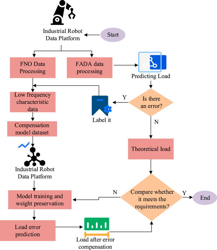According to Figure 5, to improve the accuracy of load detection for industrial robots, based on the raw physical information of robots, dynamic models and FNO networks are used to identify and predict loads. Meanwhile, to improve the detection accuracy of load by FNO, FADA model and convolutional network are introduced to enhance the raw data learning and extract important features. Finally, based on the deviation of the theoretical load and the prediction results of the convolutional network, the error correction is performed by combining the two types of data to obtain the industrial robot load detection results. The whole technical process is shown in Figure 6.