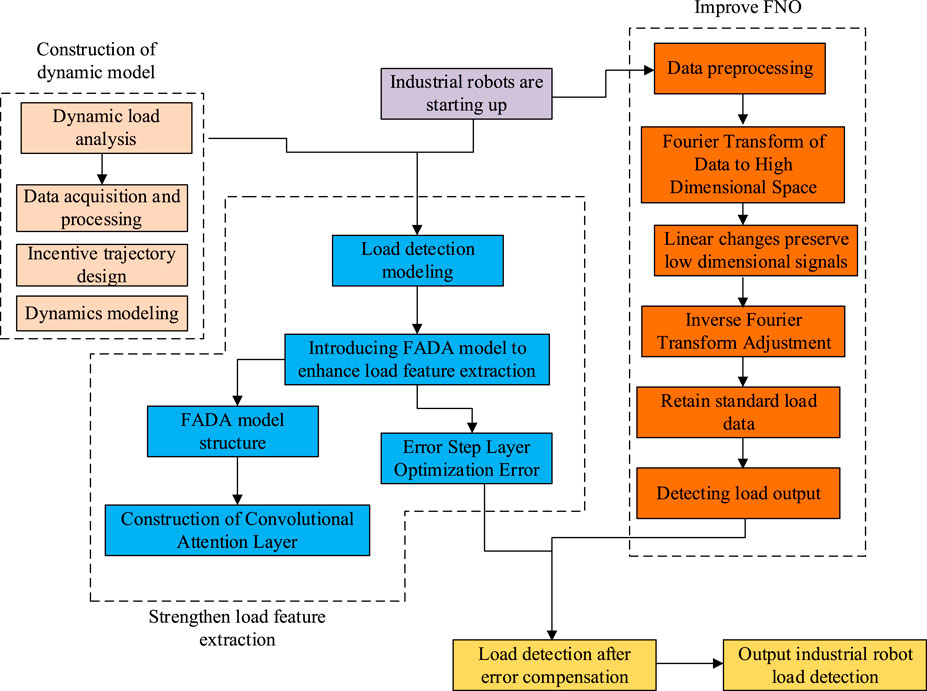 In summary, industrial robots currently play a crucial role in the field of industrial manufacturing, and numerous scholars have conducted research on parameter identification issues such as load detection and control of industrial robots. However, current industrial robots still face shortcomings in the field of robot parameter recognition. Traditional dynamic models face three limitations in complex working conditions: (1) Joint friction and temperature drift under low-load conditions significantly increase detection errors; (2) Environmental interference (such as structural flexibility deformation) causes distortion in the solution of the load force matrix; (3) There is an inherent contradiction between real-time requirements and computational complexity. Therefore, the research proposes a core hypothesis: Based on the Fourier Neural Operator (FNO) frequency domain feature extraction mechanism and the attention guided error compensation, it can synchronously solve the low-load sensitivity and environmental interference. There are two innovations in the research. One is to introduce the FNO network to extract spatial physical information and improve the accuracy of load data recognition. The second introduces the Frequency Domain Expansion-Attention Neural Network (FADA) to optimize feature extraction, while using error compensation to improve external environmental impact, further enhancing load detection accuracy. The research content will provide technical reference for high-precision control of industrial robots.